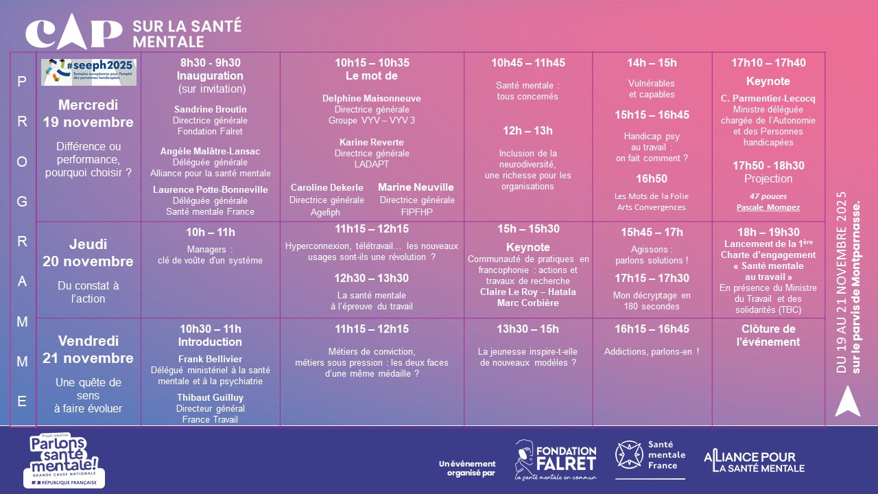 Un événement porté par la Fondation Falret, l’Alliance pour la Santé Mentale et Santé Mentale France, membres du Collectif Santé mentale Grande cause nationale, du 19 au 21 novembre 2025